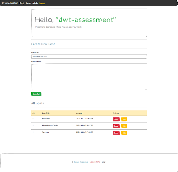 When user is logged there is automatic redirection to the admin dashboard where new post can be created, any post can be deleted, and post can be updated as well. The Logout is added to the header navigation menu - after click on it all data stored in the cookie and local storage will be wiped out.